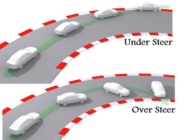 As shown in the diagram above, Understeer is when the vehicle keeps going forward when turning the vehicle, to reduce the risk of understeer, reduce the speed of the vehicle to regain control, normally Understeer is safer as it is easier to regain control compared to oversteer.